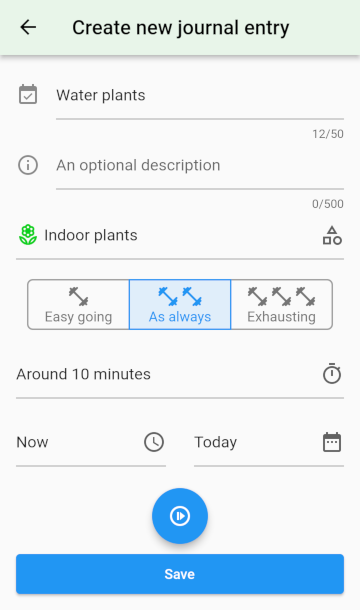 This is the heart of the app where you see all logged and tracked tasks as so called journal entries. All happended tasks are shown here in a chronological order. You can expand any task by clicking on it to see more details and options. Journal entries happened at the same day are grouped together. You can also collapse and expand these days to get a better overview.