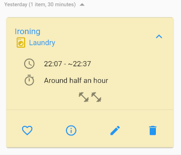 On this page you can place frequently used tasks to be tracked or logged. So if you often do “Ironing”, “Prepare breakfast” and “Water plants” you can place the task shortcuts here.