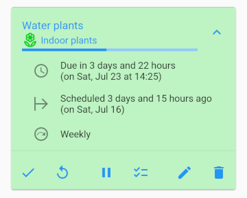 A task can be separated in so called variants to precise different things of the same task. For example the task “Wash up” has two variants, “Wash up after dinner” and “Wash up after lunch”. The only difference is the prefilled daytime.